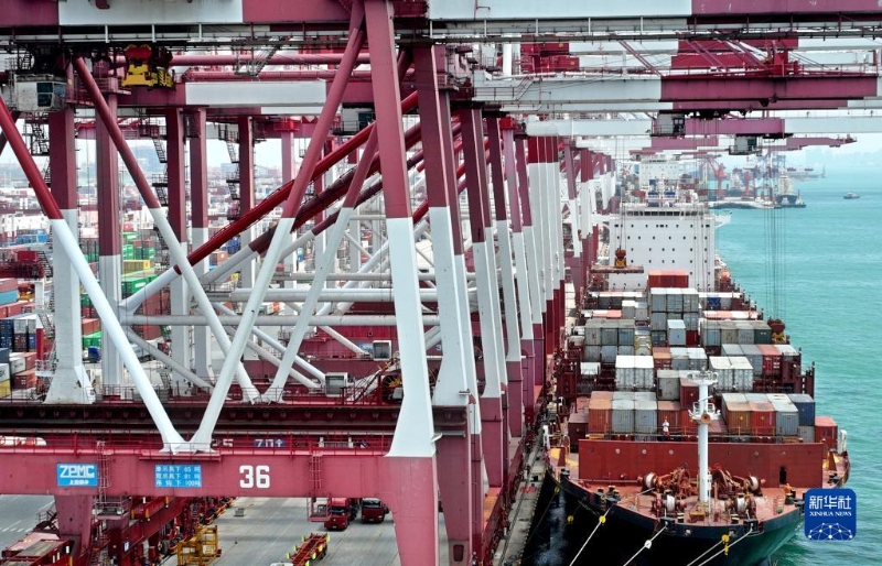 繁忙的山東港口青島港前灣港區(qū),集裝箱貨輪在裝卸集裝箱(6月15日攝,無人機(jī)照片)。