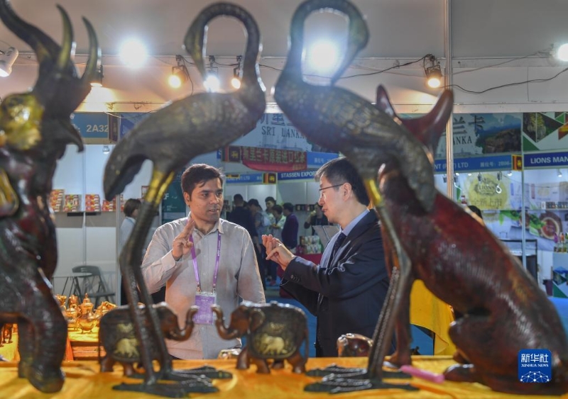 2019年4月18日,在福建泉州石獅市舉行的第五屆中國(泉州)海上絲綢之路國際品牌博覽會上,印度客商(左)向顧客推銷印度工藝品。 新華社記者 宋為偉
