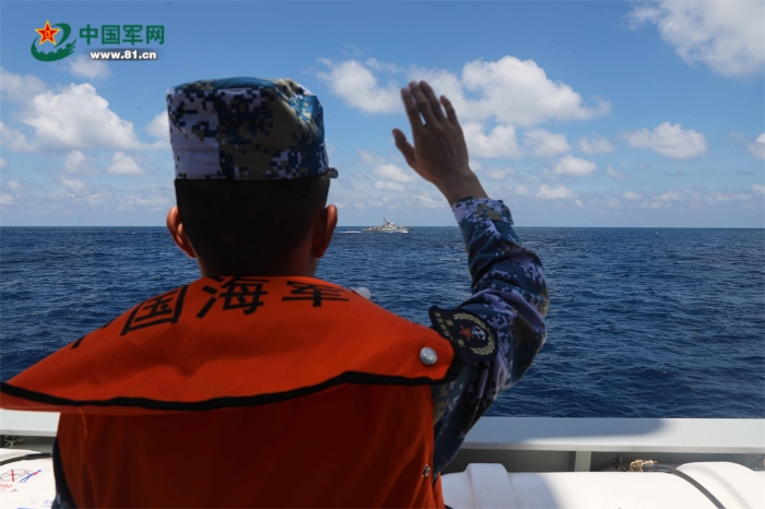 6月23日,參加中越北部灣第32次聯(lián)合巡邏的中方艦艇官兵向越方揮手告別。 張彬 攝