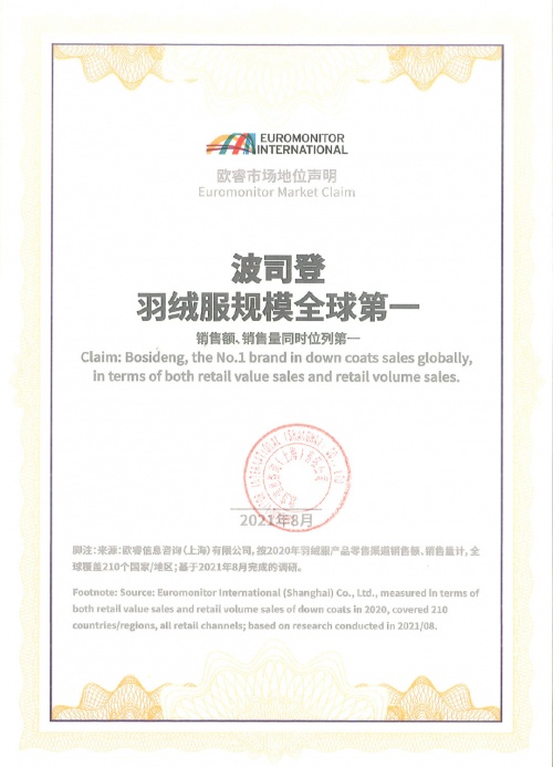 2021年,波司登首次入選國際五大品牌價值評估權威機構之一Brand Finance 公布的“2021全球最具價值服飾品牌排行榜50強(Brand Finance Apparel 50 2021)”。2022年波司登再次入選該榜單,品牌全球價值不斷提升。2021年8月,世界權威市場調(diào)查機構歐睿國際發(fā)布了2020年全球羽絨服調(diào)研報告,根據(jù)報告顯示,波司登羽絨服的銷售額、銷售量同時位列全球第一。波司登不僅向世界展示了品牌卓越潛力與魅力,更為中國服裝品牌爭取了更多國際話語權。