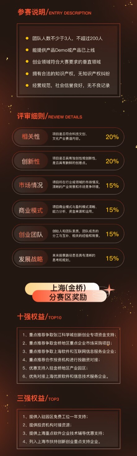 為助力企業(yè)復(fù)工復(fù)產(chǎn),扶持優(yōu)秀創(chuàng)新創(chuàng)業(yè)項(xiàng)目,參與并獲得本次CITC上海金橋賽區(qū)分賽十強(qiáng)的項(xiàng)目將獲得張江科學(xué)城創(chuàng)新創(chuàng)業(yè)專項(xiàng)資金、金橋地區(qū)重點(diǎn)企業(yè)市場(chǎng)采購項(xiàng)目、上海軟件和互聯(lián)網(wǎng)信息服務(wù)業(yè)企業(yè)等項(xiàng)目的重點(diǎn)推薦,獲得分賽區(qū)前三強(qiáng)的項(xiàng)目將獲得上海金橋網(wǎng)易聯(lián)合創(chuàng)新中心一年免租金入駐、供投資機(jī)構(gòu)對(duì)接、技術(shù)輔導(dǎo)等。
