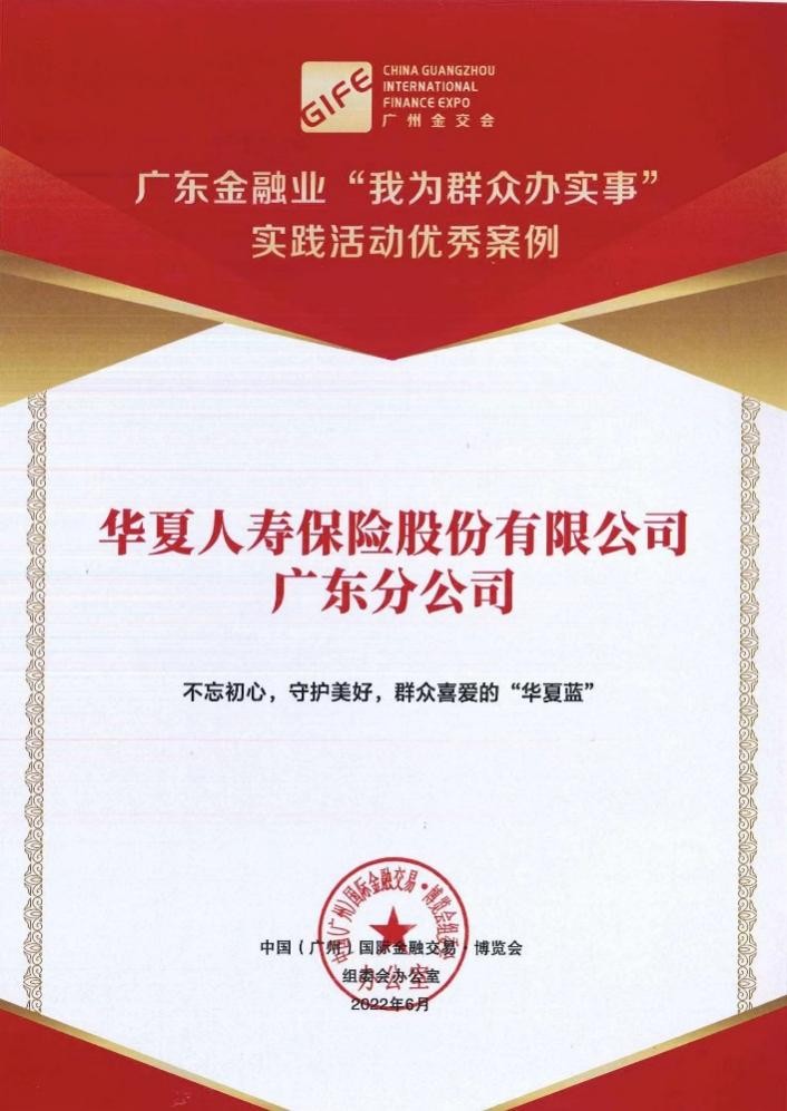 2022年6月24日下午,在第11屆中國(廣州)國際金融交易?博覽會上,華夏保險廣東分公司“不忘初心,守護(hù)美好,群眾喜愛的‘華夏藍(lán)’”公益行動,榮獲“廣東金融業(yè)‘我為群眾辦實事’實踐活動優(yōu)秀案例”,表明其在金融業(yè)履行便企利民社會責(zé)任實踐中的突出貢獻(xiàn)得到社會高度認(rèn)可。
