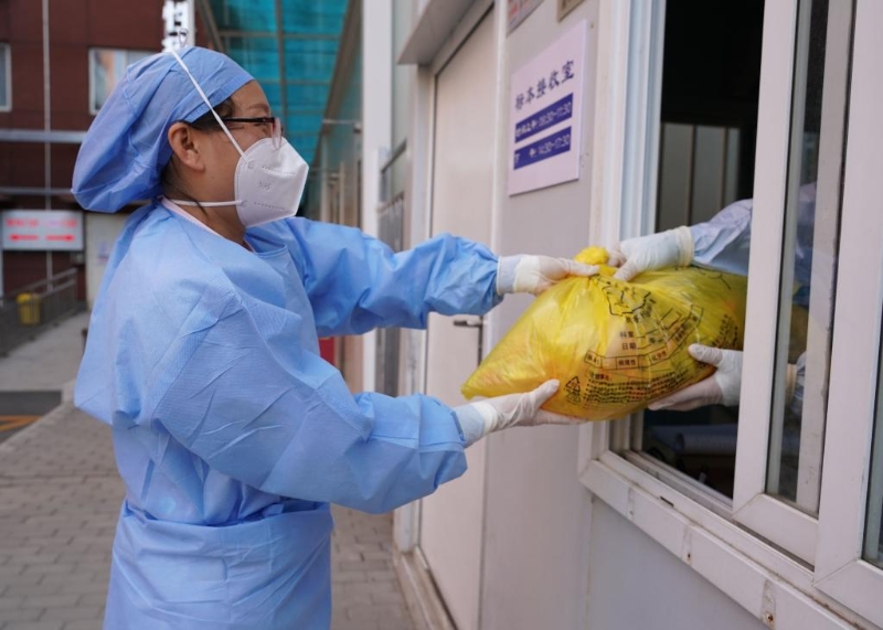 5月25日,在北京市上地醫(yī)院,護(hù)師將取回的隔離酒店人員的核酸樣本交給樣本接收室醫(yī)務(wù)人員。新華社記者 任超 攝