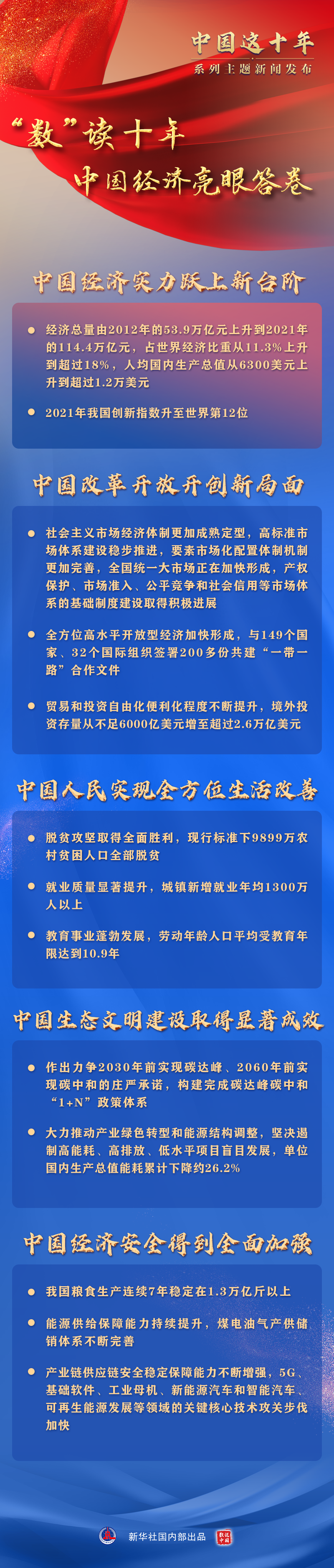 “回顧黨的十八大以來經(jīng)濟社會發(fā)展的光輝歷程,在習近平經(jīng)濟思想的指引下,我國正在加快邁向更高質(zhì)量、更有效率、更加公平、更可持續(xù)、更為安全的發(fā)展之路,我國的經(jīng)濟實力、科技實力、綜合國力、國際影響力持續(xù)增強,我們以實際行動交出了一份人民滿意、舉世矚目、可以載入史冊的中國答卷?!?/p>