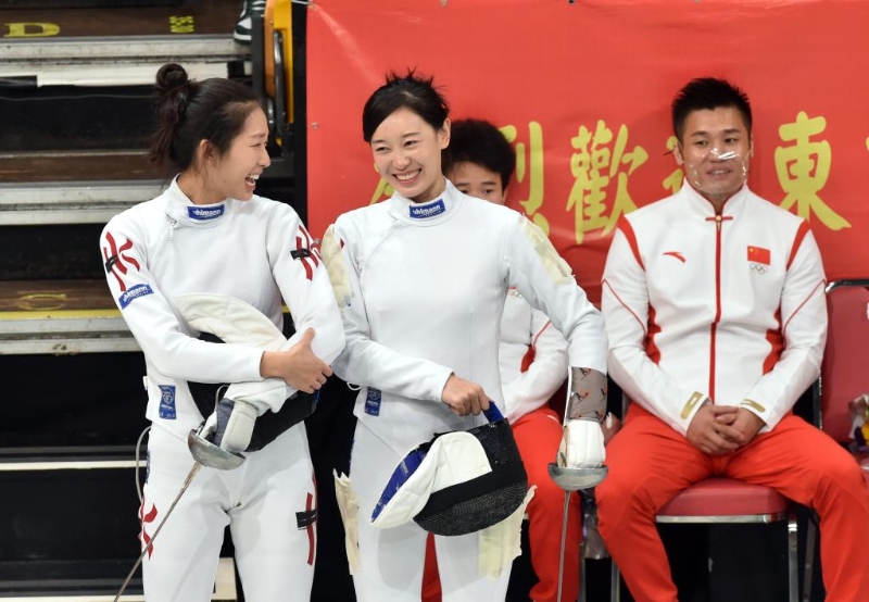 2021年12月4日,內(nèi)地奧運(yùn)健兒代表團(tuán)訪港一行進(jìn)入第二天的活動。中國擊劍選手孫一文(前右)與中國香港擊劍選手江旻憓(前左)在活動中交談。新華社記者盧炳輝攝