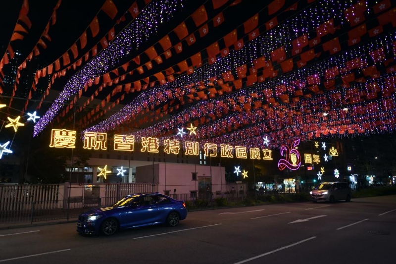 新華社香港6月26日電(記者韋驊)距離香港回歸祖國25周年紀念日還有幾天時間,喜慶的氣氛已在香港街頭洋溢。港島、九龍、新界,大大小小的慶祝橫幅、海報點綴著大街小巷;到了夜晚,一束束斑斕的燈光照亮這座城市的墨色蒼穹。