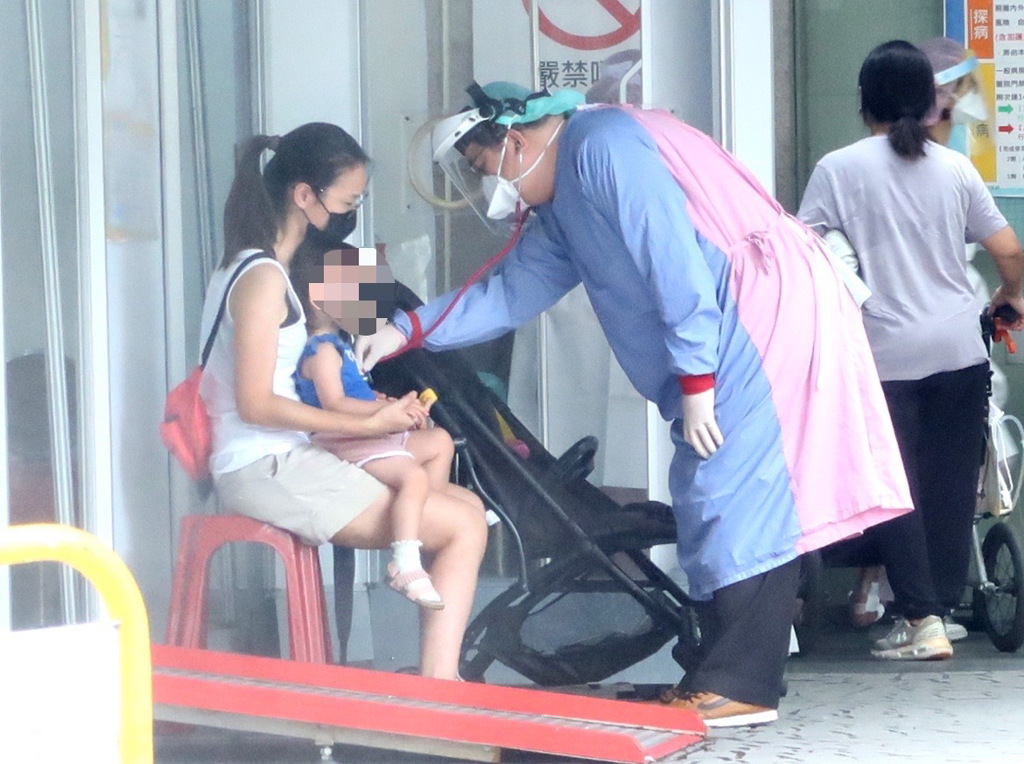 臺(tái)“指揮中心”評(píng)估,要真正與新冠病毒共存,恐怕還是要等好幾年。圖為家長帶著孩子去防疫急門診的畫面。(粘耿豪攝)