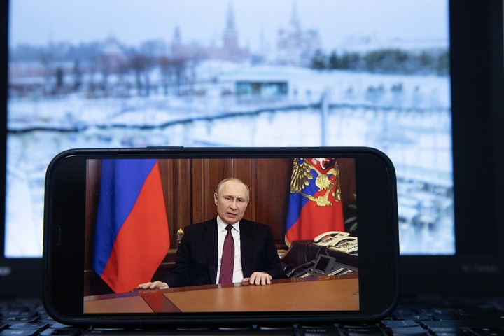 這是2月24日在俄羅斯首都莫斯科拍攝的俄總統(tǒng)普京發(fā)表電視講話的畫面。新華社記者白雪騏攝