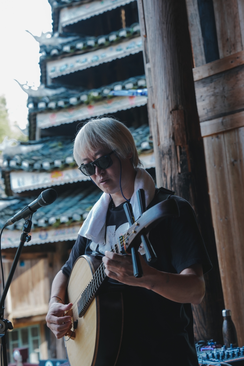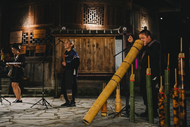 來自新民族樂隊——金竹樂團《藏在深山里的音符》和《回》兩首樂曲的演奏則利用了村寨的農(nóng)具和自制的本土樂器,創(chuàng)造出獨一無二的即興音樂;點睛之筆——聲笙共振邀請了來自宰蕩侗寨的蘆笙隊與兩組音樂人共同完成,電子音樂的編排與新民族音樂的加入賦予了傳統(tǒng)、重復(fù)的蘆笙旋律全新的視聽享受。