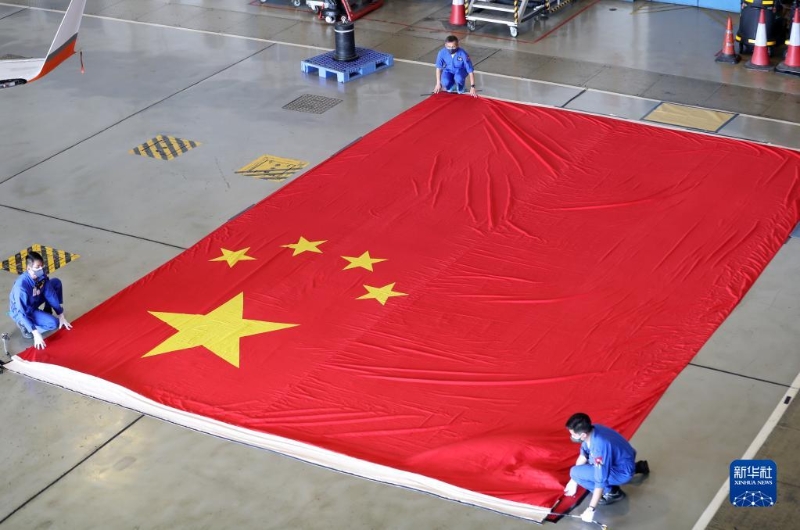直升機(jī)務(wù)教官蔡澤民套上鞋套,戴上白手套,拿著夾有《國(guó)旗及國(guó)徽條例》的文件夾,一一對(duì)照檢查。國(guó)旗是在具備資質(zhì)的廠家專門定制的,規(guī)格規(guī)范都有嚴(yán)格要求。國(guó)旗大,就有拼接。蔡澤民主要查看色澤是否飽滿和均勻,接縫是否平整,四條邊上有沒有線頭等,特別要注意的是,五顆星星處不可有接縫。一番操作下來,后背已然濕透。