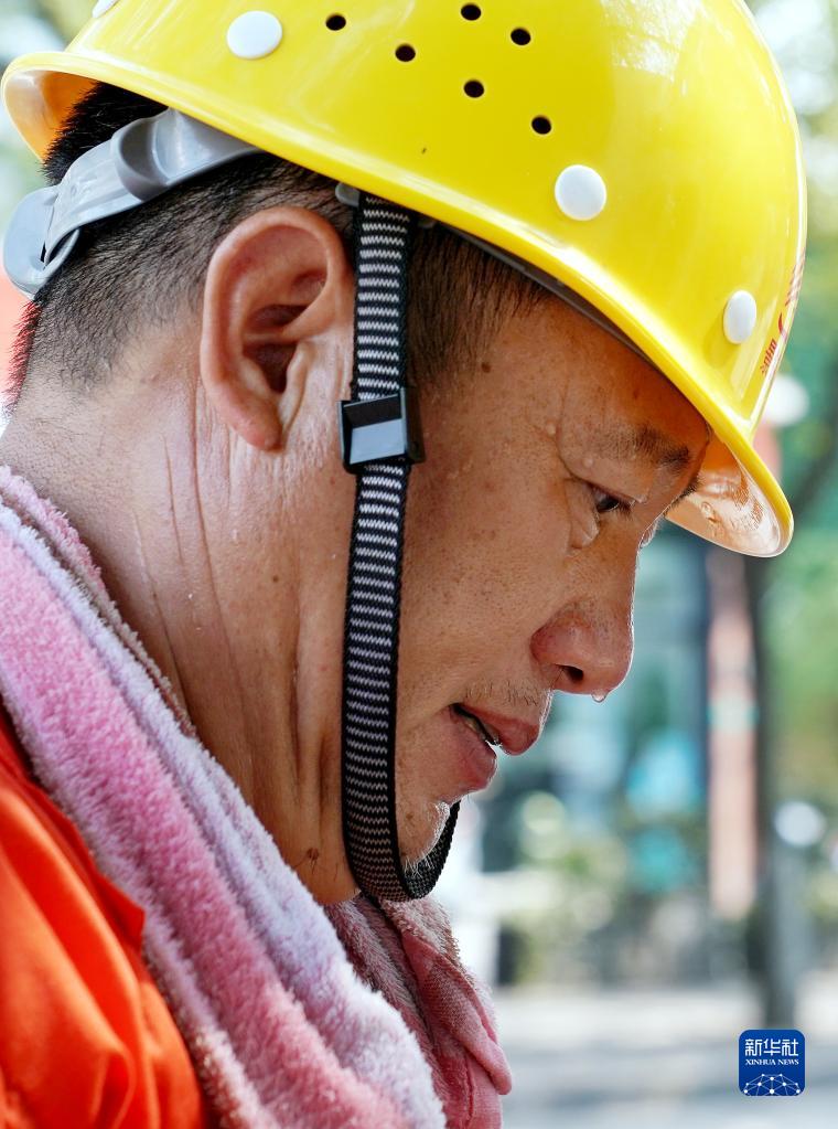7月10日,在上海市閔行區(qū),冒著高溫施工的市政人員滿(mǎn)臉汗水。