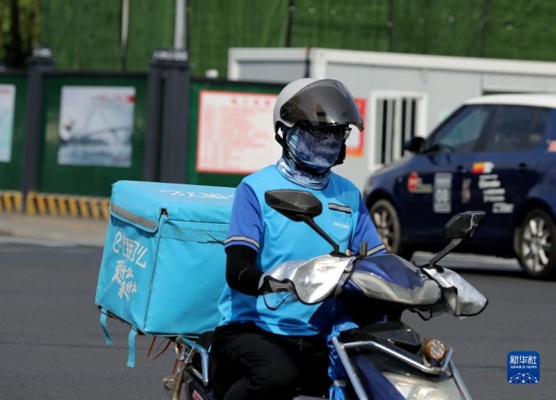 7月10日,在上海市閔行區(qū),外賣(mài)配送員在烈日下騎行。