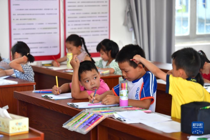 7月10日,在廣西融安縣長安鎮(zhèn)大洲村新時代文明實踐站,孩子們在繪畫培訓(xùn)課上畫畫。