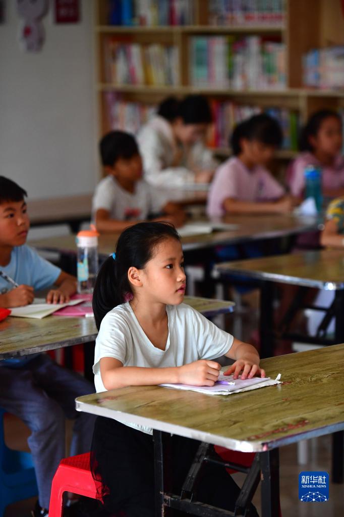 7月10日,在廣西融安縣融康社區(qū),孩子們在書法培訓(xùn)班上聽課。