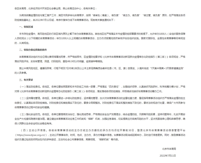 11日晚,北京市體育局網(wǎng)站發(fā)布《北京市體育局關于有序恢復舉辦體育賽事活動的通知》(《通知》)稱,按照“誰審批(備案)、誰負責”“誰主辦、誰負責”“誰主管、誰負責”原則,在嚴格落實各項防控措施基礎上,自7月12日起,有序恢復舉辦線下體育賽事活動。據(jù)悉,恢復辦賽將嚴格落實風險評估、實名制管理、測溫、掃碼驗碼、查驗48小時以內(nèi)核酸、疫苗接種等措施?! ?/p>