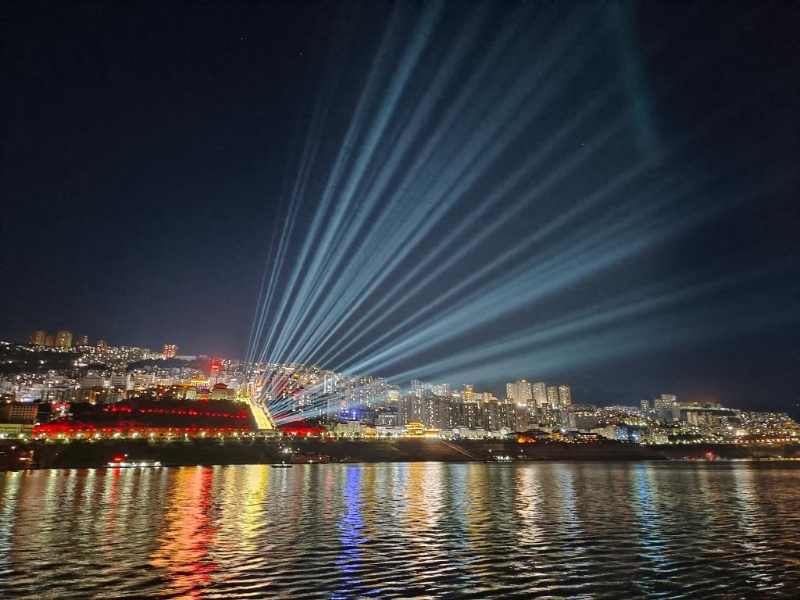 巫山縣“三峽之光”夜間情景游的燈光秀。新華社記者周凱 攝