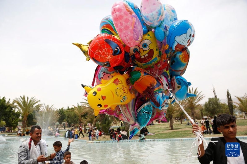 7月11日,小販在也門薩那一處游樂園賣氣球。西亞北非多國從7月9日開始宰牲節(jié)假期,然而持續(xù)的通貨膨脹沖淡了節(jié)日氛圍。人們無力舉辦傳統(tǒng)慶祝儀式,商家銷售慘淡,不少人直言這個(gè)宰牲節(jié)“不幸?!薄P氯A社發(fā)(穆罕默德·穆罕默德攝)