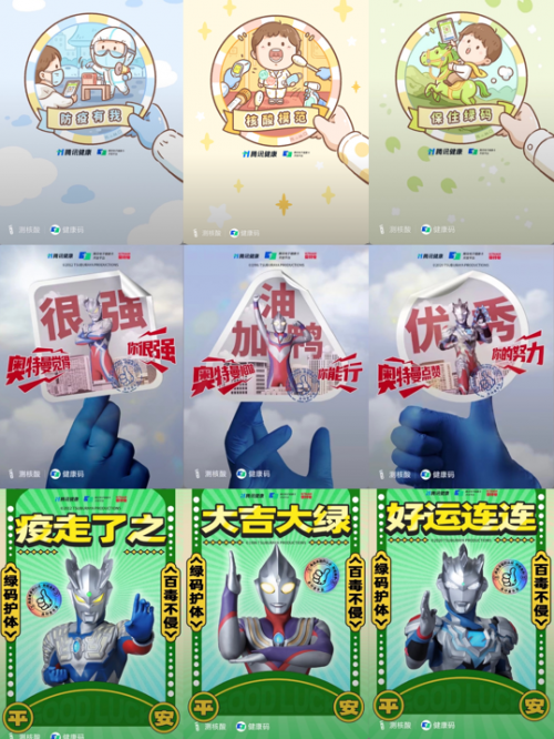 同時(shí),騰訊健康還聯(lián)合90后漫畫(huà)家、《熱干面加油》作者陳小桃及奧特曼中國(guó)官方共同推出趣味“核酸貼紙”:“大白”自制掃碼神器、測(cè)核酸模范成為“代言人”、打工人力求“保住綠碼”、宇宙最強(qiáng)奧特曼送上“花式夸夸”……畫(huà)風(fēng)可愛(ài)、充滿(mǎn)細(xì)節(jié)的微信狀態(tài)背景圖深受網(wǎng)友喜愛(ài),專(zhuān)屬“核酸貼紙”更是大家分享和傳遞同心抗疫信念的紀(jì)念徽章,成為當(dāng)下全民防疫的社交新“窗口”。