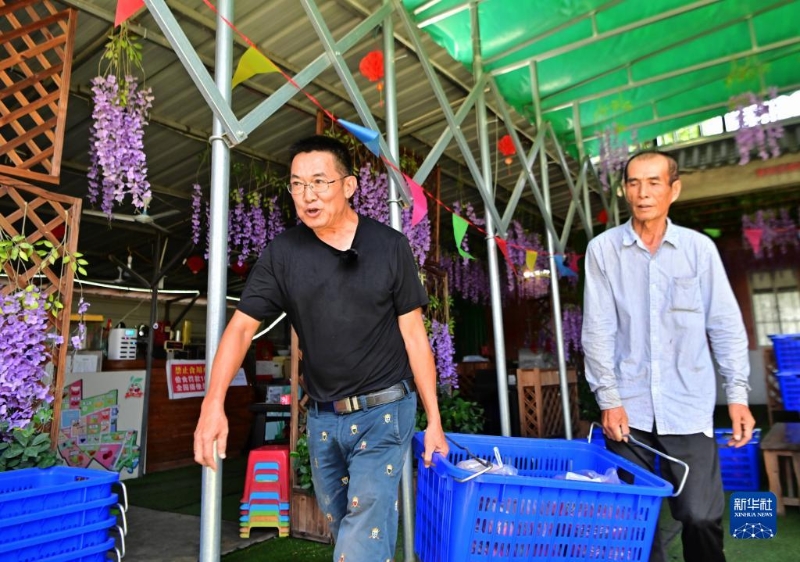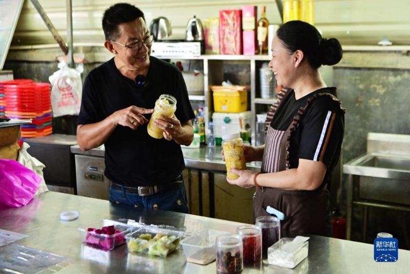 7月11日,在位于廈門市翔安區(qū)的榮杰園觀光農(nóng)場,農(nóng)場負責人、臺胞宋志平(左)在指導員工腌制水果。