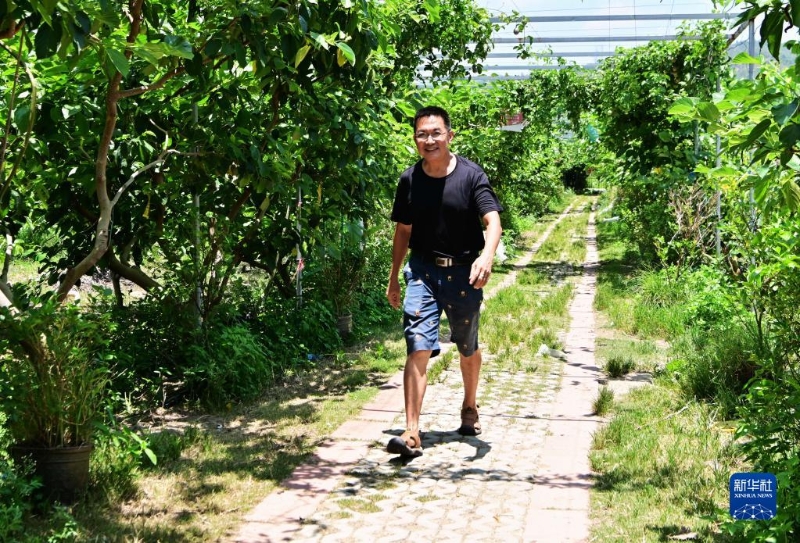 7月11日,在位于廈門市翔安區(qū)的榮杰園觀光農(nóng)場,農(nóng)場負責人、臺胞宋志平在查看水果園的果樹長勢。