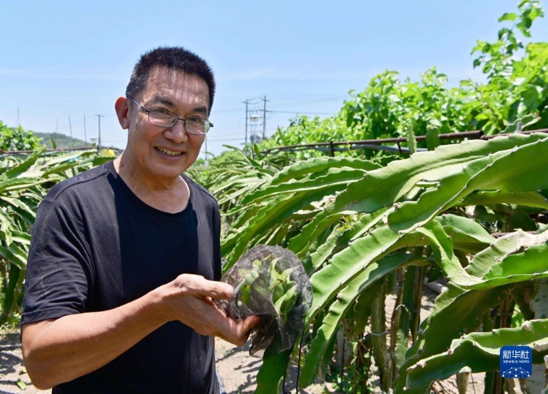 7月11日,在位于廈門市翔安區(qū)的榮杰園觀光農(nóng)場,農(nóng)場負責人、臺胞宋志平在查看火龍果長勢。