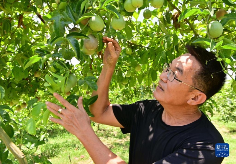 7月11日,在位于廈門市翔安區(qū)的榮杰園觀光農(nóng)場,農(nóng)場負責人、臺胞宋志平在查看百香果長勢。