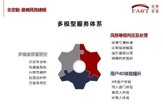 根據(jù)企業(yè)需求建立企業(yè)自身的風(fēng)險評判模型,并明確不同風(fēng)險等級候選人的雇傭決策標(biāo)準(zhǔn)。協(xié)助企業(yè)確立對報告質(zhì)量及供應(yīng)商的考核標(biāo)準(zhǔn)。