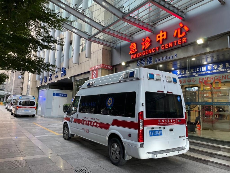 7月13日下午,浙大二院急診中心外停著多輛急救車。(圖片由受訪者提供)