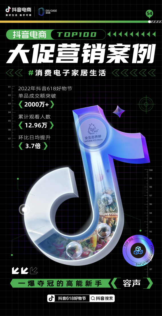 日前,抖音電商攜手十大行業(yè)百余個(gè)優(yōu)秀商家、達(dá)人,針對(duì)“618好物節(jié)”,推出了#抖音電商Top100大促營(yíng)銷案例#。容聲冰箱憑借“聚焦做爆款”的思路,以用戶需求為主導(dǎo),以離子凈味501冰箱為主打,一舉獲得“一爆奪冠的高能新手”稱號(hào)。