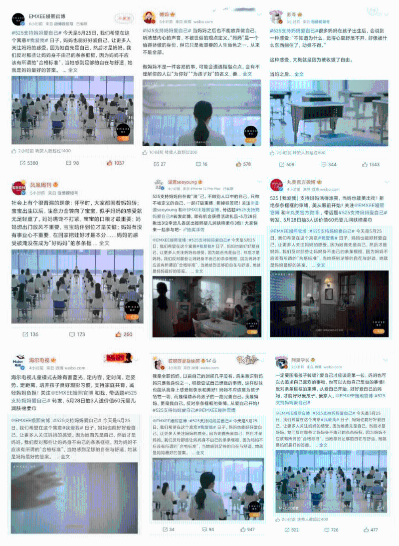 525當(dāng)天,視頻微博話題#525支持媽媽愛(ài)自己#也沖上熱搜,嫚熙聯(lián)合奇葩說(shuō)知名辯手傅首爾、作家蘇芩等明星大V,visit看天下、三聯(lián)生活周刊、廣州日?qǐng)?bào)、鳳凰周刊等知名媒體,以及丸美、滋源等知名品牌共同發(fā)聲,號(hào)召媽媽們不要為了周圍的聲音改變自我、犧牲自我,做傳統(tǒng)意義上的“完美”媽媽,鼓勵(lì)媽媽們學(xué)會(huì)關(guān)注自己、愛(ài)自己,讓更好的自己成為孩子的榜樣。