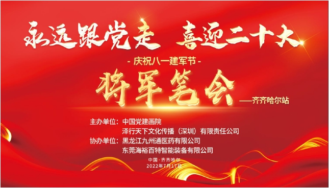 此次活動(dòng)由黑龍江省九州通醫(yī)藥有限公司、澤行天下文化傳播(深圳)有限責(zé)任公司、中國(guó)黨建畫(huà)院、東莞海裕百特智能裝備有限公司共同舉辦;原沈陽(yáng)軍區(qū)司令員、蘭州軍區(qū)司令員、中國(guó)解放軍軍事科學(xué)院院長(zhǎng)劉精松上將、原空軍副司令景學(xué)勤中將、原海軍副司令趙興發(fā)中將、原國(guó)防大學(xué)副政委李殿仁中將、原黑龍江省人大常委副主任胡世英、海軍原副參謀長(zhǎng)段昭顯少將、北京衛(wèi)戍區(qū)政治部主任馬譽(yù)煒將軍、原國(guó)防科技大學(xué)電子科學(xué)與工程學(xué)院政治委員樂(lè)道斌少將、原遼寧省軍區(qū)副司令尚全孝少將、原中央警衛(wèi)局副局長(zhǎng)龔光新少將、開(kāi)國(guó)上將賀炳炎之女賀北生、謝長(zhǎng)平夫婦、亞太經(jīng)合研究會(huì)會(huì)?鄧新橋、中國(guó)黨建畫(huà)院院長(zhǎng)張文祥、原黑龍江省科協(xié)黨組書(shū)記陶福勝、原黑龍江省安全局局長(zhǎng)王捷、齊齊哈爾軍分區(qū)政委杜偉、黑龍江國(guó)際交流協(xié)會(huì)副會(huì)長(zhǎng)呂占明、中水電集團(tuán)黨委副書(shū)記夏璐蒙、獲得5項(xiàng)世界吉尼斯紀(jì)錄的書(shū)畫(huà)大師張克思、聯(lián)合國(guó)世界環(huán)保大使趙藝兵(藝名:半邊毛)、黑龍江省九州通醫(yī)藥有限公司副總經(jīng)理王铓軼、黑龍江省九州通醫(yī)藥有限公司齊齊哈爾區(qū)域負(fù)責(zé)人劉志、黑龍江省九州通醫(yī)藥有限公司齊齊哈爾區(qū)域市場(chǎng)總監(jiān)顧昊、澤行天下文化傳播(深圳)有限責(zé)任公司總經(jīng)理趙悅云南省美途教育投資發(fā)展有限公司董事長(zhǎng)王玲娟、昆明言續(xù)商貿(mào)有限公司經(jīng)理王理總等近百位嘉賓參加此次活動(dòng)?;顒?dòng)同時(shí)特邀黑龍江少年軍校二馬路小學(xué)的少先隊(duì)員代表參與了筆會(huì)。
