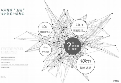 卓越集團(tuán)在調(diào)研中發(fā)現(xiàn),每個(gè)人的生活體驗(yàn)由他所在的10KM(事業(yè))、1KM(配套)、10M(社區(qū))和1M(家庭)范圍內(nèi)的空間和人物決定。四種日常軌跡到達(dá)的距離和場(chǎng)所為業(yè)主創(chuàng)造了最主要的生活、工作、社交場(chǎng)景,每個(gè)距離都對(duì)應(yīng)代表客戶的空間需求。