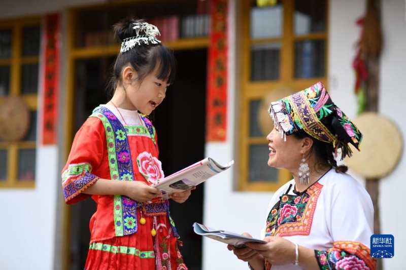 7月19日,湖南省邵陽市城步苗族自治縣長安營鎮(zhèn)民族文化傳播服務(wù)中心,一名小朋友在向“六月六”山歌節(jié)市級傳承人陳巖花(右)學(xué)習(xí)唱山歌。