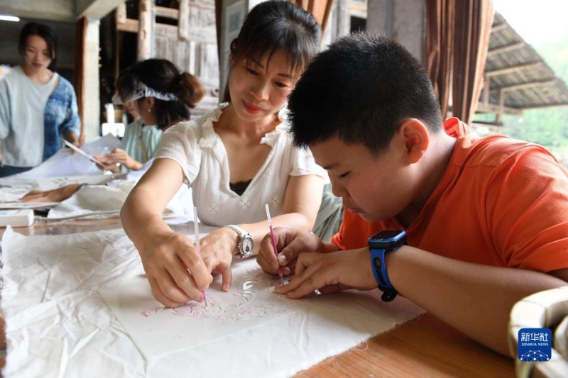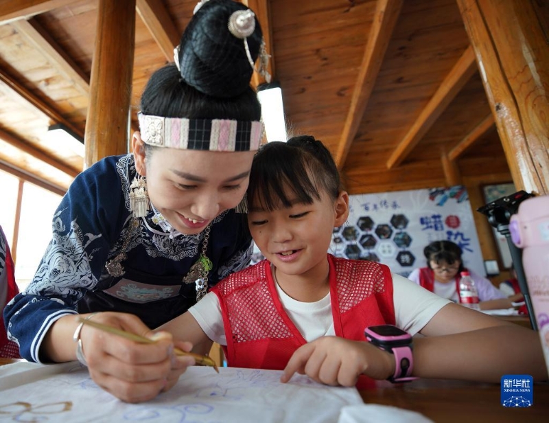 7月20日,苗族蠟染技藝傳承人張義蘋(左一)在貴州省黔東南苗族侗族自治州丹寨縣龍泉鎮(zhèn)卡拉村苗族蠟染工坊內(nèi)指導(dǎo)一名小朋友學(xué)畫蠟畫。
