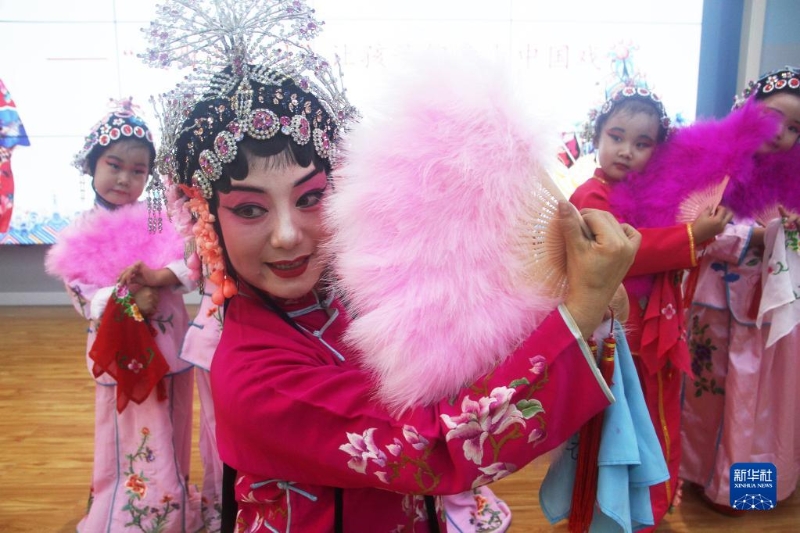 7月20日,在河北省唐山市豐潤區(qū)太平路街道同慶社區(qū),戲曲老師指導(dǎo)小朋友練習(xí)戲曲動(dòng)作。