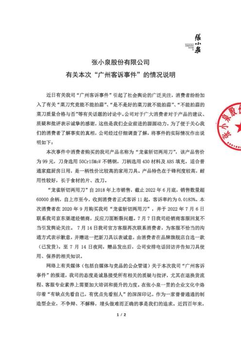 張小泉品牌官方發(fā)布的情況說(shuō)明。