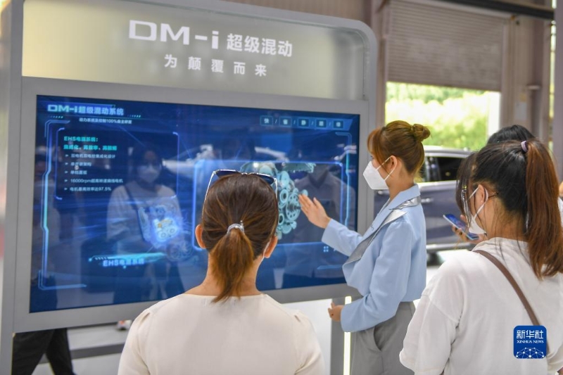 7月22日,比亞迪汽車展臺的工作人員講解新能源汽車工作原理。