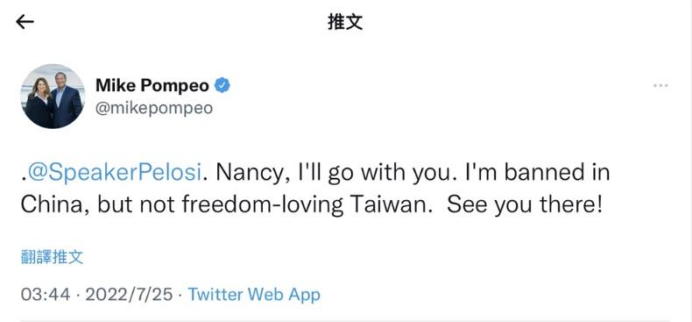 蓬佩奧在推特上標(biāo)記佩洛西的賬號(hào),并寫說(shuō)“我會(huì)跟你去。我在中國(guó)(大陸)被制裁,但在熱愛自由的臺(tái)灣沒有,到時(shí)候那里見!”