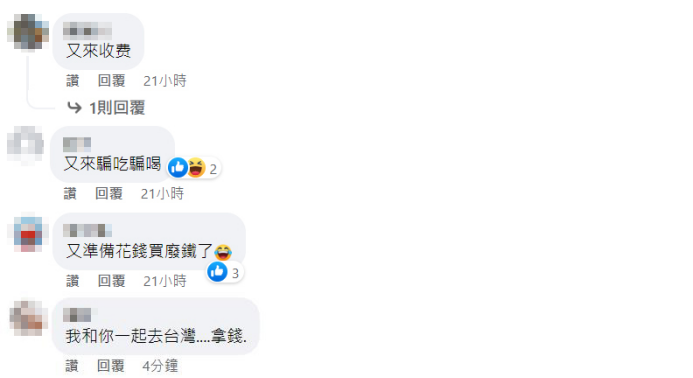 還有網(wǎng)友直呼:“又來(lái)收費(fèi)”、“又來(lái)騙吃騙喝”、“又準(zhǔn)備花錢買廢鐵了”、“我和你一起去臺(tái)灣...拿錢”。