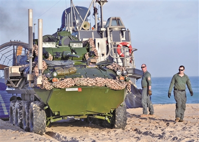 美以聯(lián)合軍演中,美國海軍陸戰(zhàn)隊(duì)LAV-25裝甲車從氣墊登陸船上駛出(資料圖)。