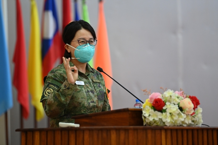 7月27日,“和平列車”醫(yī)療隊(duì)副隊(duì)長(zhǎng)褚玲玲在老撾萬象老撾人民軍103醫(yī)院作學(xué)術(shù)報(bào)告。新華社發(fā)(曾理攝)
