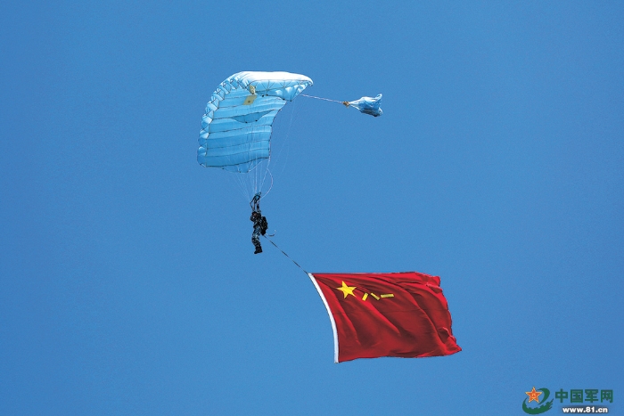 正在進(jìn)行傘降實(shí)跳訓(xùn)練的空降兵某旅官兵以特有的方式慶祝自己的節(jié)日。 盛 超攝