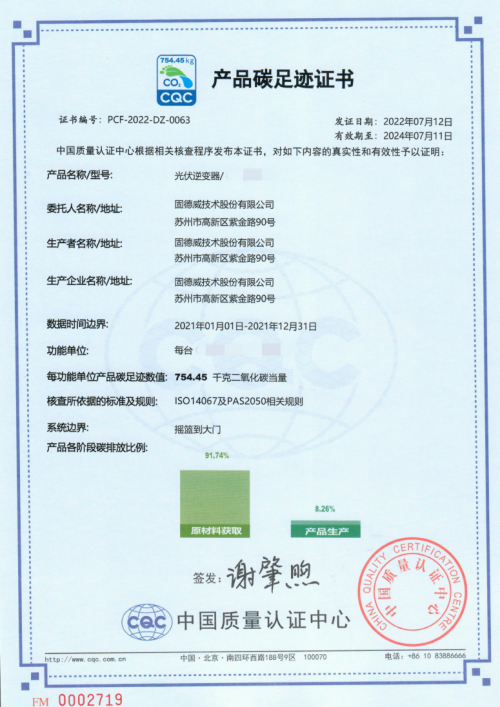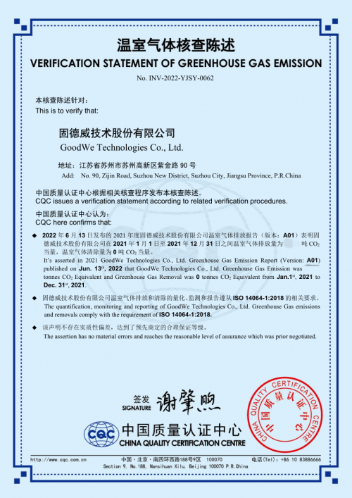 2022年7月,固德威獲得由中國質(zhì)量認(rèn)證中心的雙料認(rèn)證,對(duì)其頒發(fā)產(chǎn)品碳足跡認(rèn)證書及溫室氣體核查陳述認(rèn)證證書,固德威不僅為客戶提供智慧零碳解決方案,其自身也在不斷踐行綠色發(fā)展理念,充分體現(xiàn)了固德威作為一家大企業(yè)在綠色時(shí)代中的決心和擔(dān)當(dāng)。