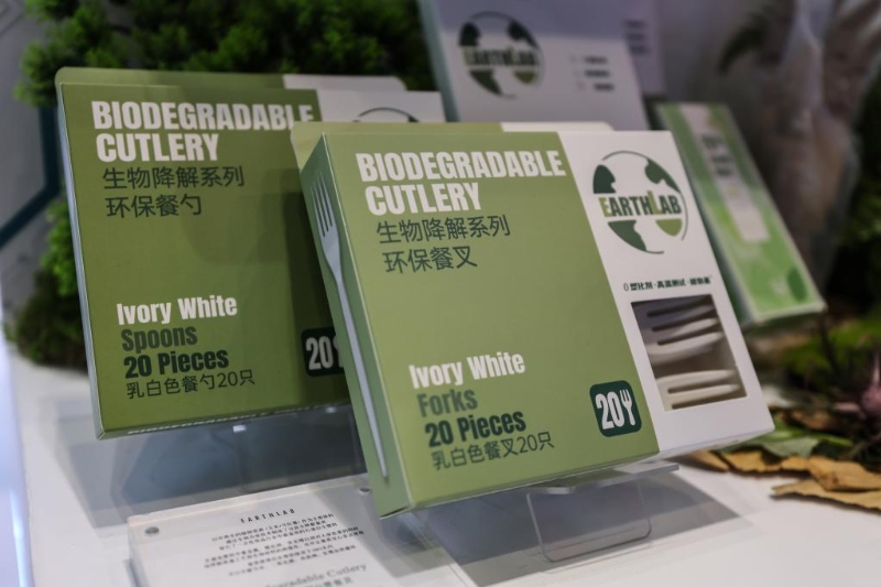 7月27日,這是在第二屆消博會(huì)現(xiàn)場展出的生物降解系列餐具。新華社記者 張麗蕓 攝