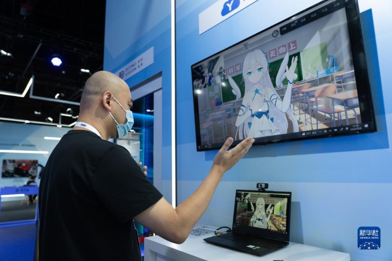 7月28日,在2022全球數(shù)字經(jīng)濟大會元宇宙體驗館,一名工作人員展示“云游長城”小程序。