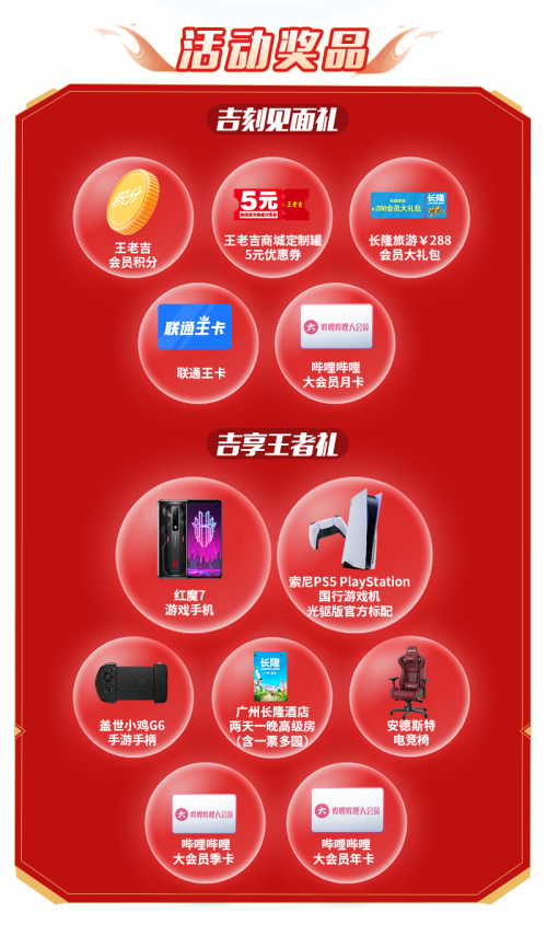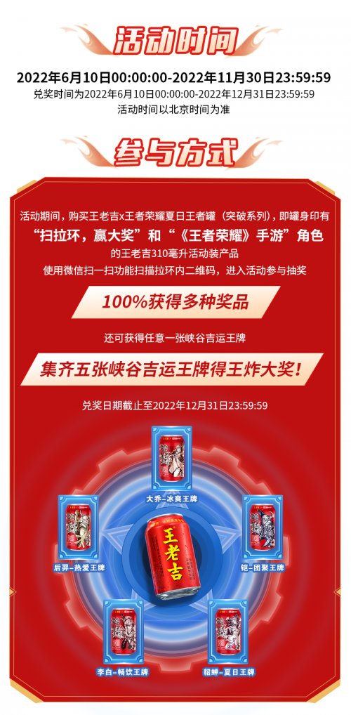 本次發(fā)布的王老吉X王者榮耀夏日王者罐(突破系列)還隱藏著加碼驚喜福利,玩家只需打開拉環(huán)掃碼,就能參與王老吉X王者榮耀“掃拉環(huán)贏大獎”活動,即有機會獲得索尼PlayStation 5 、紅魔7游戲手機、安德斯特電競椅、廣州長隆酒店兩天一晚高級房(含一票多園)、蓋世小雞G6手游手柄、嗶哩嗶哩大會員等獎品!