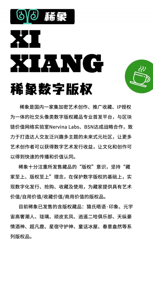 稀象一直相信以政策為主導(dǎo)的版權(quán)IP交易市場(chǎng),才是數(shù)藏流轉(zhuǎn)市場(chǎng)的最后歸宿。并且始終堅(jiān)定如一地相信,好的版權(quán)IP一定是能夠連續(xù)產(chǎn)出版權(quán)價(jià)值,以及成為具有真正收藏意義的稀缺版權(quán)作品。