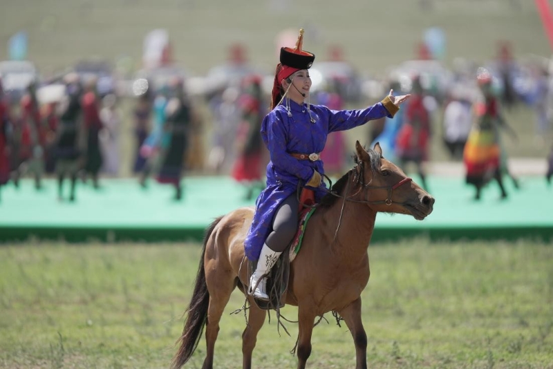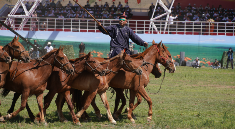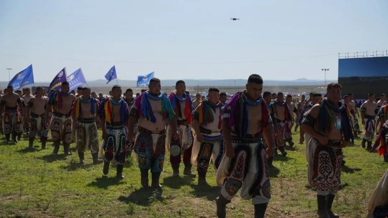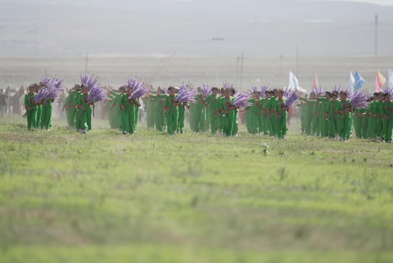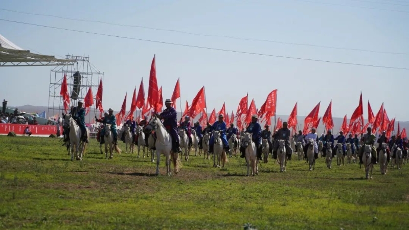 開幕式共由熱場環(huán)節(jié)、入場式、開幕式、文藝演出等環(huán)節(jié)組成。彩色旗幟飄揚(yáng)在錫林郭勒大草原,各民族兄弟姐妹們穿著傳統(tǒng)民族服飾款款走來,國旗隊與中國馬都馬隊、男兒三藝、烏蘭牧騎、草原旅拍服飾、草原旅拍網(wǎng)紅與各景區(qū)宣傳、游客等方隊依次亮相。今年是內(nèi)蒙古自治區(qū)成立75周年,開幕式上無論是馬隊還是男兒三藝方隊,馬匹數(shù)量和人員數(shù)量都是75。游客參與方隊則由來自全國各地的游客方隊、屬地徒步方隊、騎行方隊組成。