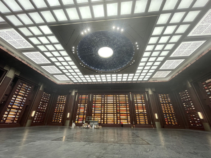 在國(guó)家版本館中央總館的西宕口壁上,還藏有一個(gè)長(zhǎng)達(dá)800米的洞庫(kù),洞就是洞穴的洞,庫(kù)是倉(cāng)庫(kù)的庫(kù)。洞庫(kù)分為12個(gè)獨(dú)立庫(kù)區(qū),呈U字形路區(qū),每個(gè)約500平方米,其中7個(gè)洞庫(kù)內(nèi)設(shè)洞窟空間收藏鎮(zhèn)館之寶。比如,1號(hào)洞庫(kù)是雕版特藏庫(kù),集中收藏清代漢、蒙、藏、滿(mǎn)《大藏經(jīng)》雕版,2號(hào)洞庫(kù)是《四庫(kù)全書(shū)》特藏庫(kù),集中收藏文淵閣、文溯閣、文津閣、文瀾閣四閣真本和仿真影印版本《四庫(kù)全書(shū)》。而在洞庫(kù)的四周及天頂,是由敦煌研究院組織創(chuàng)作的壁畫(huà)。