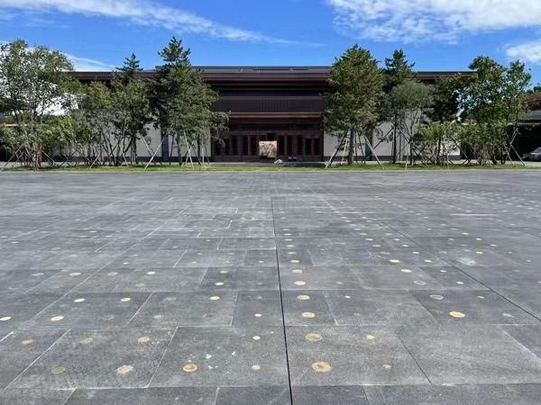 第二進(jìn)院落當(dāng)中,我們可以看到,在地上排布著大小不一的銅點(diǎn)。朱育帆說(shuō),這其實(shí)內(nèi)藏乾坤,顏色不同的圓點(diǎn),就呼應(yīng)著分色裝潢的四庫(kù)全書(shū)?!拔覀兯膸?kù)全書(shū)里邊經(jīng)史子集,在色譜里邊有5個(gè)顏色,四庫(kù)全書(shū)是5種套封,所以就用5種顏色來(lái)映射這種樸素的行為。這個(gè)地方是整個(gè)場(chǎng)地里邊最大的一個(gè)硬質(zhì)廣場(chǎng)區(qū),以后也可以在這里舉辦活動(dòng),所以它就是一種文化的暗示?!敝煊硎?。